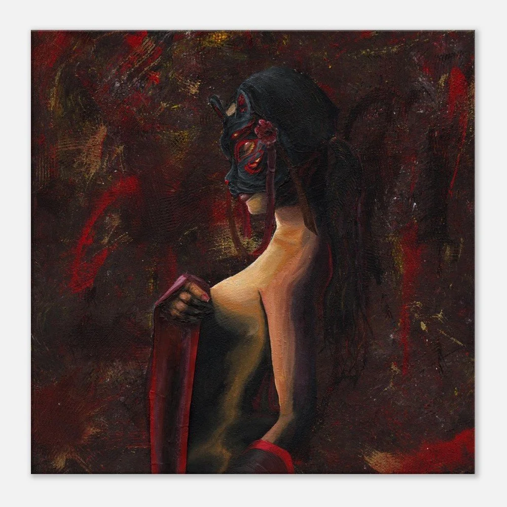 „Kitsune“ zeigt eine verhüllte Frau im Halbschatten, ihr Gesicht verborgen hinter einer roten Maske.
